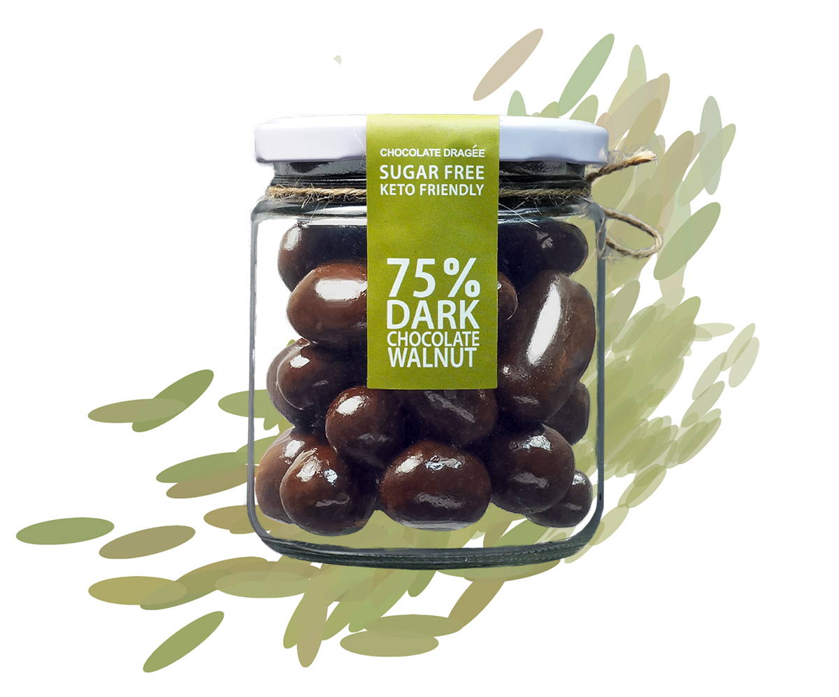 Discover a guilt-free indulgence that brings together the rich allure of dark chocolate and the wholesome goodness of walnuts in our 75% sugar-free keto-friendly dragées. Crafted to cater to your health-conscious desires, these delectable treats offer a truly blissful experience for your taste buds.